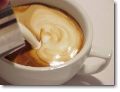 then slowly sweep through the steamed milk and espresso to form a multi-layered heart.