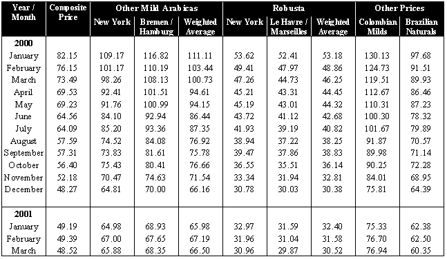 Table 1. Historical Indicator Prices for 2000 and the beginning of 2001. All prices are in US cents per pound.